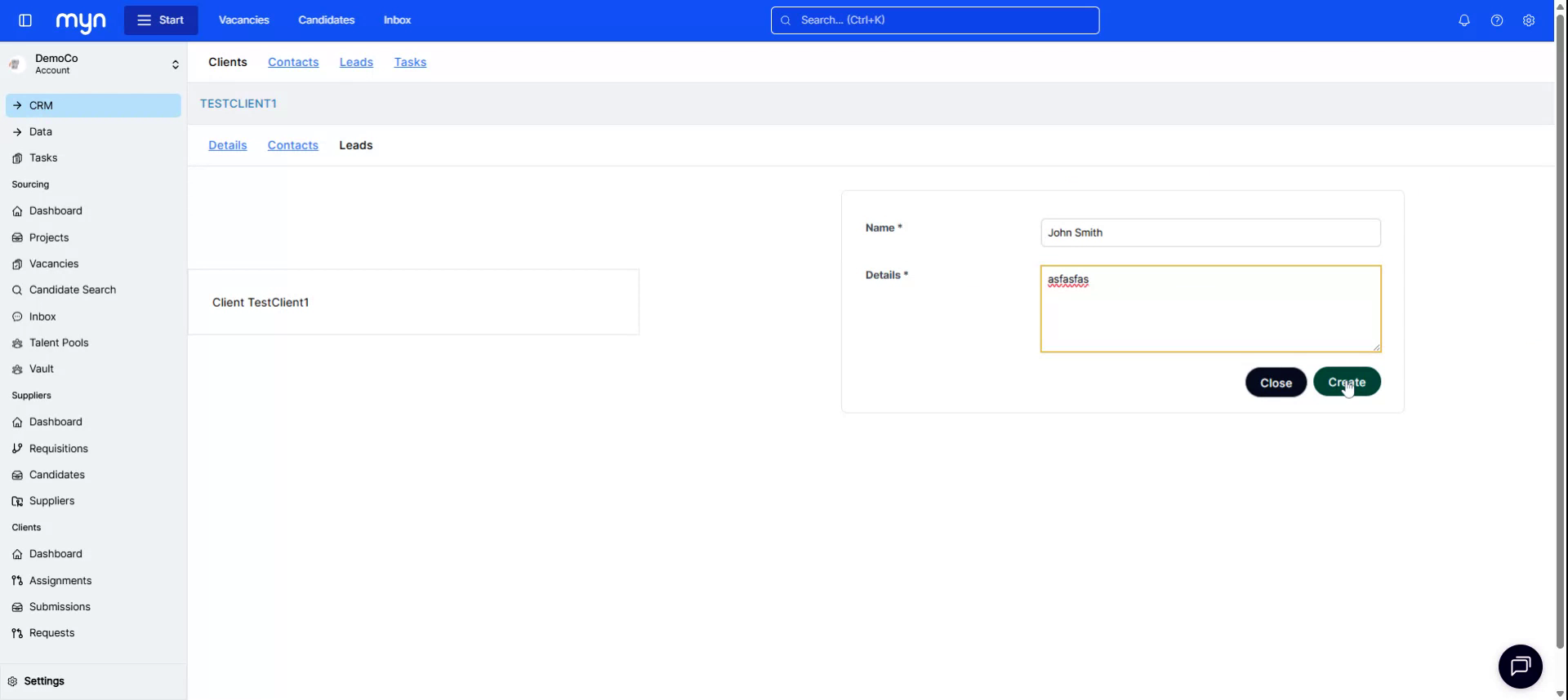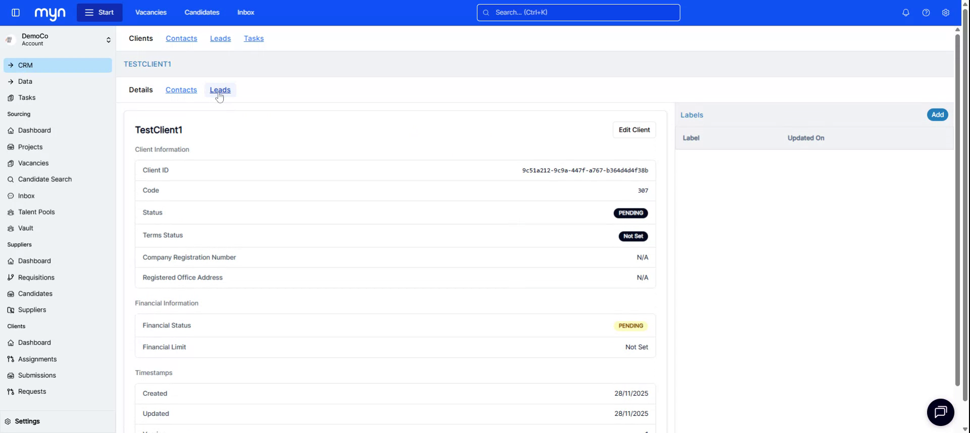 To manage this client and their progress, use the Leads option in the top corner of the CRM.